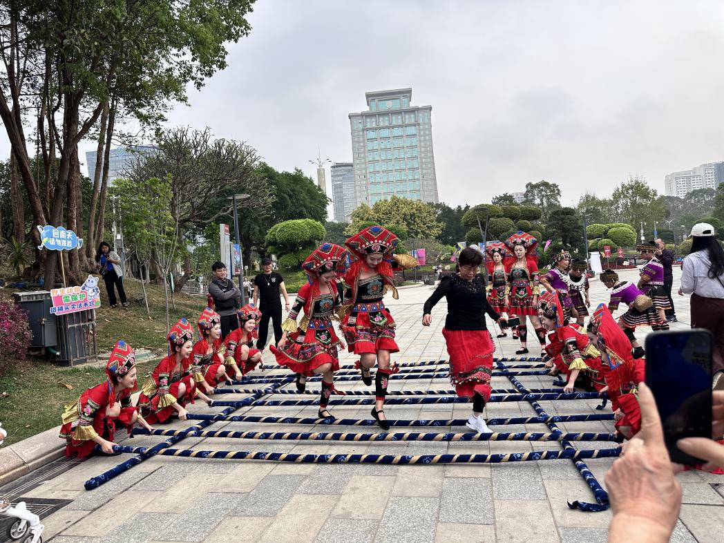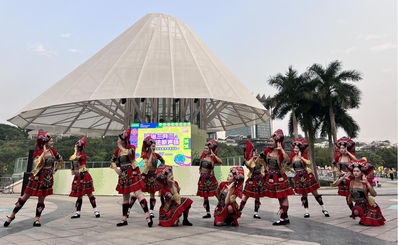 此次宣传专场活动以民族节庆为纽带,打造“科技+非遗+民族+国际交流”等多维度立体化的法治宣传矩阵。活动中,音乐与舞蹈学院12名同学身着绚丽多彩的少数民族服饰,唱山歌、跳壮舞、打竹竿,依托花市、潮玩普法街等场景,参与了迎宾、花市、竹竿舞、多谢了等多场景演出,精彩的表演受到了一致好评。