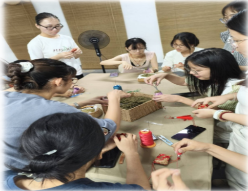 活动伊始,宣讲人苏杨洁宣传讲解资助政策,介绍国家助学贷款政策和各类奖助学金评选要点,讲述往届受助学生的真实典型案例。随后,工作人员对壮族香囊的起源、制作工艺、文化内涵进行了介绍,并现场演示香囊中药材配比(如艾草、丁香等)与缝制技巧,讲解香囊“驱邪纳福”的寓意。参与活动的同学纷纷动手制作,现场氛围热烈而融洽,同学们围坐在一起相互交流制作心得,分享技巧经验。成果传递环节中,同学们手持亲手制作的香囊相互展示,围绕刺绣技法、标语寓意及资助政策感悟展开热烈交流。